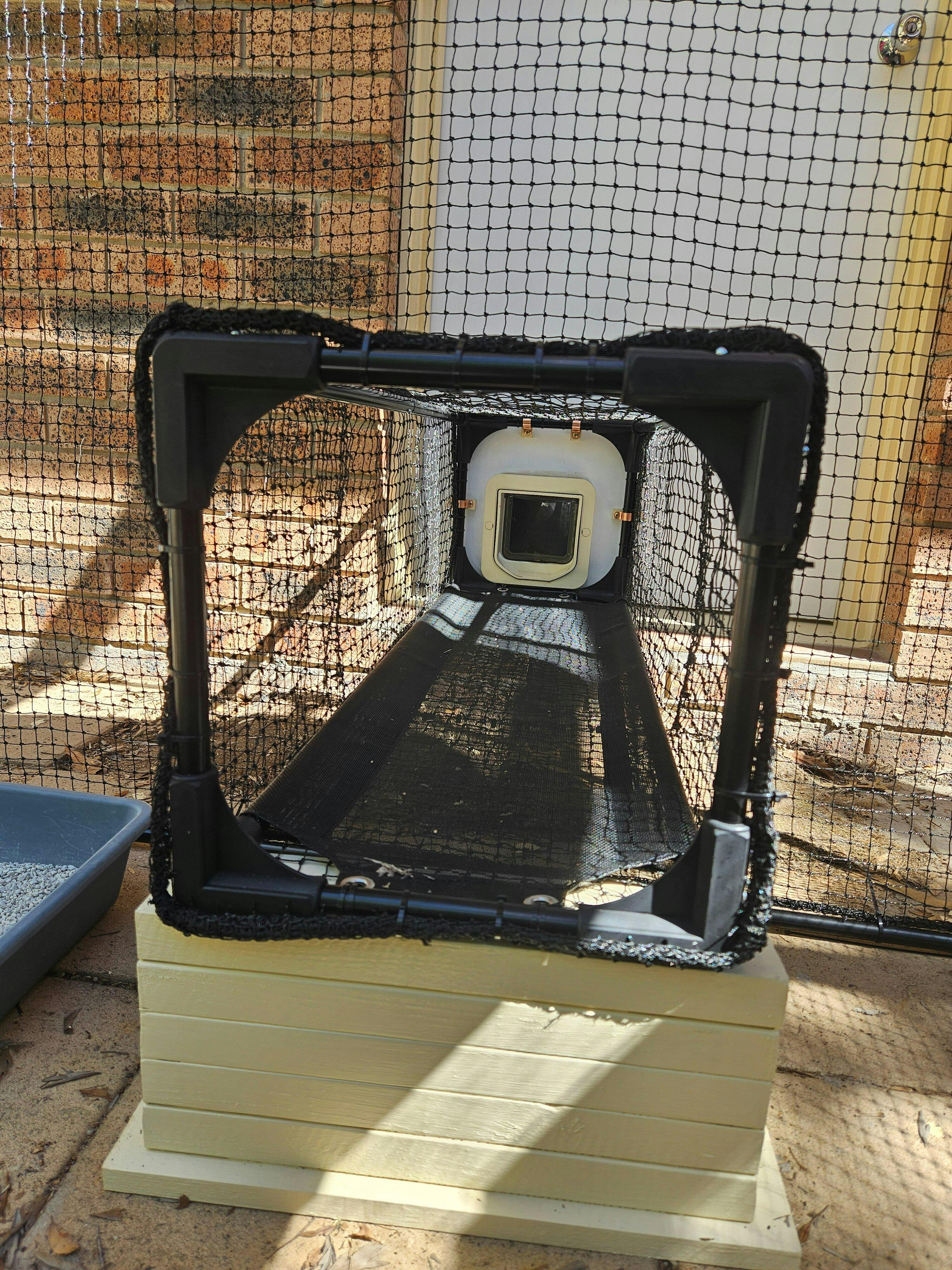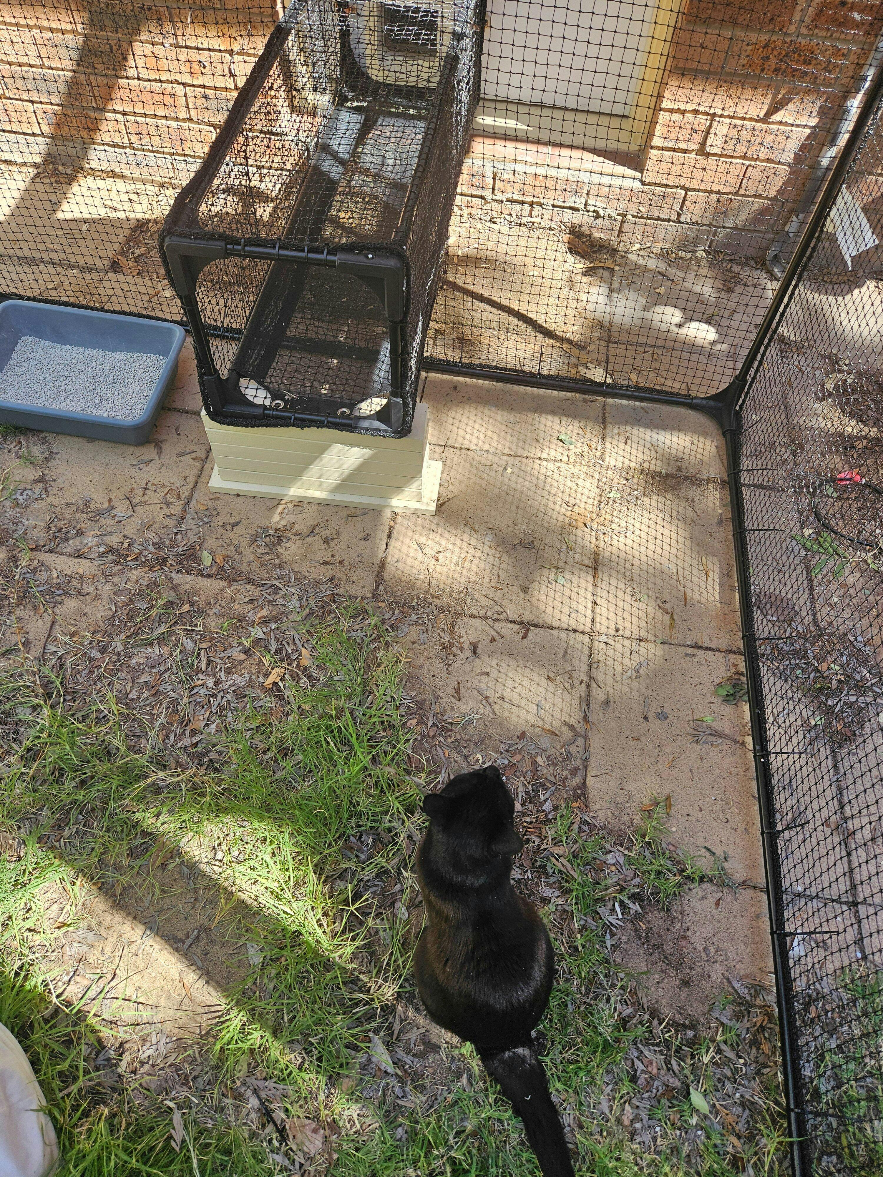 Took ages with multiple calls to courier and a replacement order, but enclosure finally set up with custom connection to the house. Has gone down a treat with the cats!